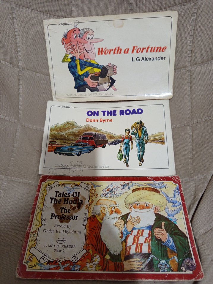 Resimde gördüğünüz 3 adet 2 seviye İngilizce hikayeler. her biri ortalama 15 sayfadır. içlerinde bazı yerlerde kurşun kalemle işaretlemeler vardır.LG Alexander'dan 'Worth a Fortune', Donn Byrne'dan 'On the Road' ve Önder Renkli Yıldırım tarafından yeniden anlatılan 'Tales of The Houa The Professor' kitapları.