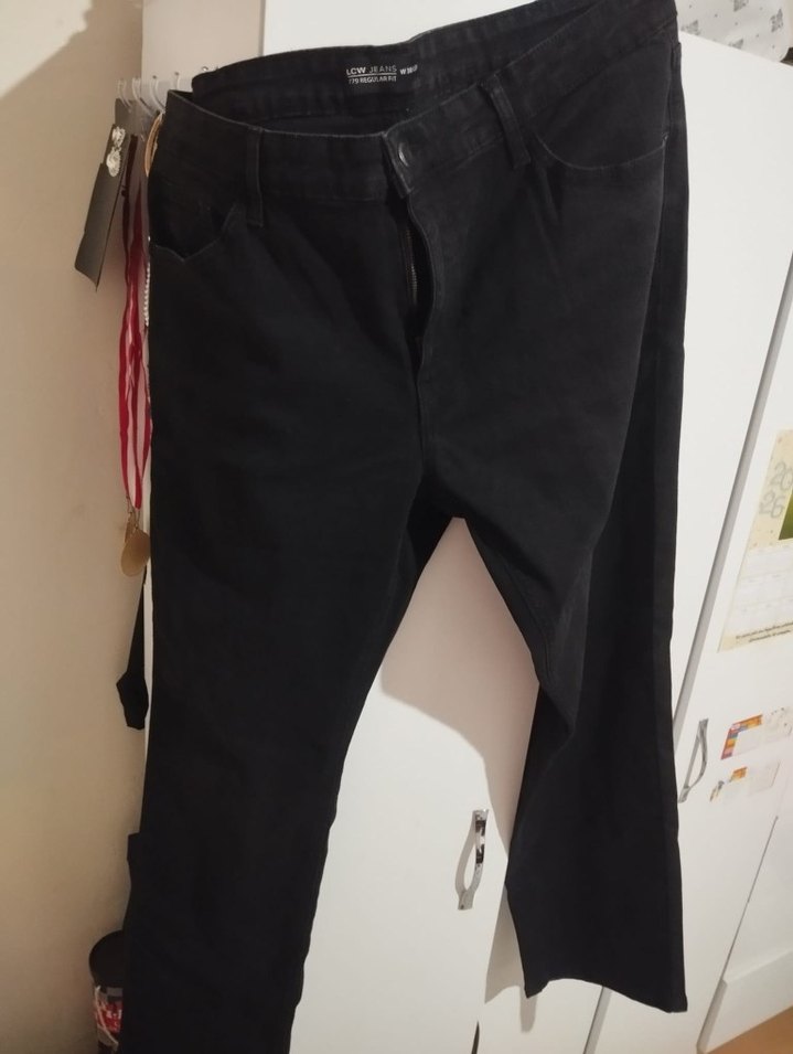 Siyah, rahat kesim kot pantolon, kemerli ve günlük kullanım için uygun. Normal boyda, sokak stiliyle uyumlu.
