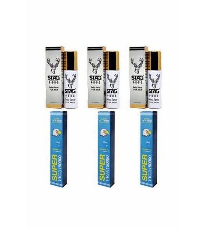 Erkekler için 3 adet Stag tıraş köpüğü ve 3 adet Super Vig 150000 geciktirici sprey içeren set.