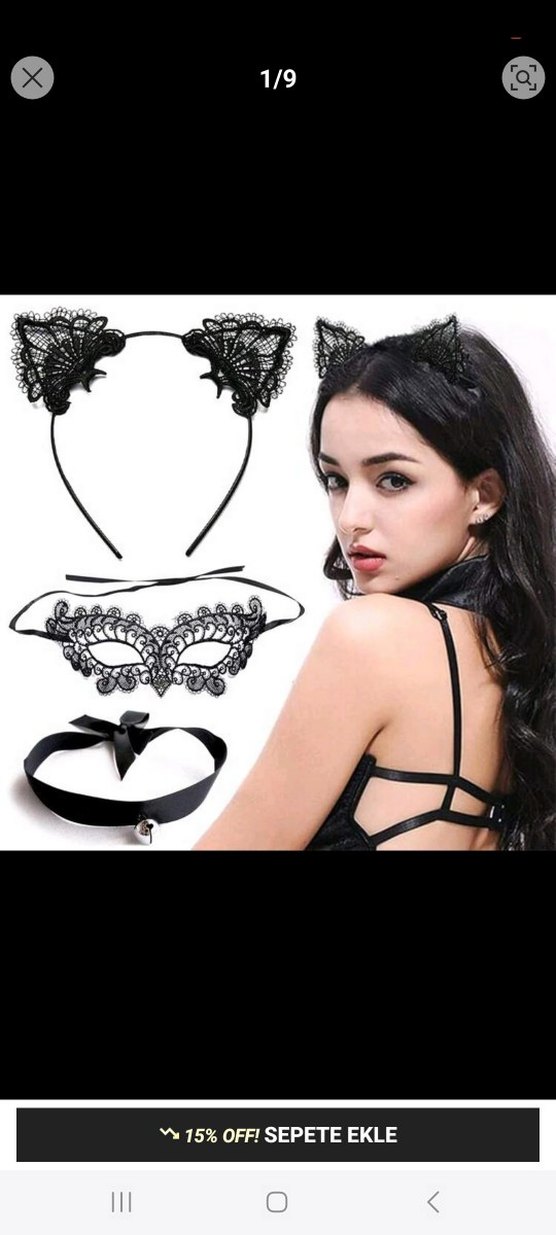 Siyah dantel kedi kulaklı taç, uyumlu dantel maske ve küçük zil detaylı kurdele kolye, gotik parti için uygun.