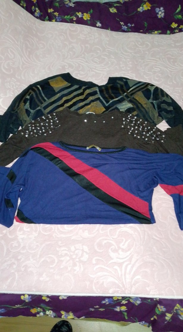 3 adet uzun kollu kışlık üst kahverengi boncuklu koyu renkli desenli mor siyah kırmızı çizgili tarzda 3 adet üst esneyen kumaş yıkayıp rahatlıkla kullanabilirsiniz yırtı vesaire yok.
