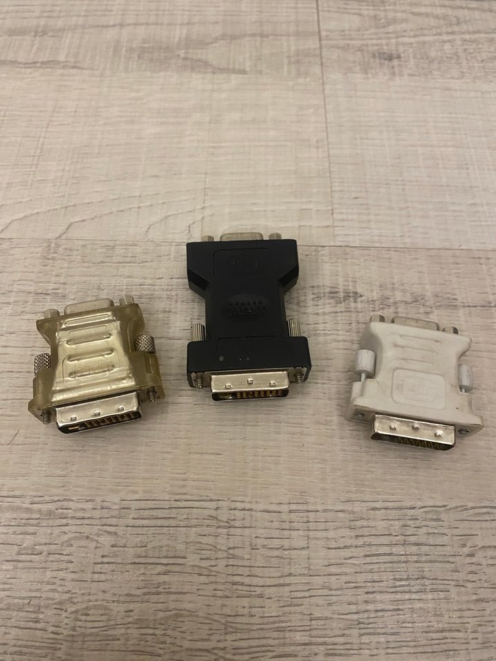 Farklı ekran cihazlarını bağlamak için beyaz ve gri renklerde üç adet DVI adaptör çevirici. Bilgisayar aksesuarları arasında yer alır.