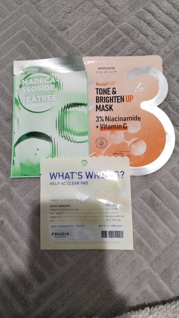 Madec Ssoside Teatree, Watsons Tone & Brighten Up (3% Niacinamide + Vitamin C) ve Frudia Help AC Clear Pad içeren üç adet yüz maskesi.