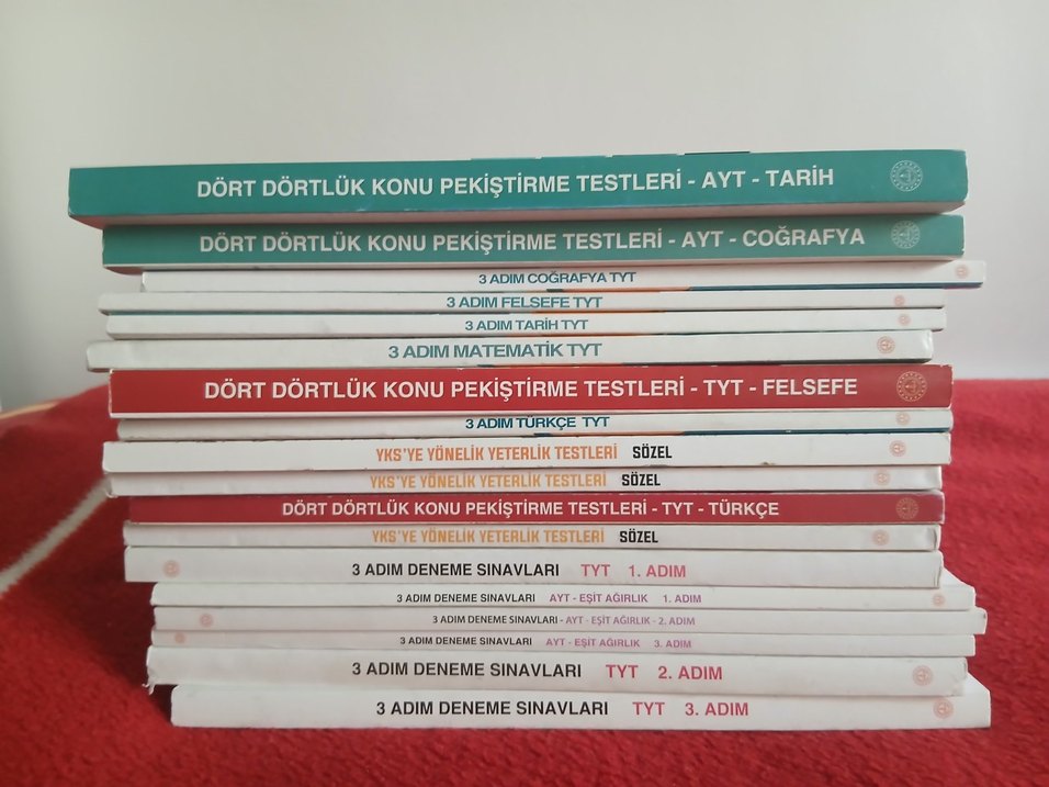 TYT ve AYT için matematik, tarih, felsefe, coğrafya ve Türkçe gibi konuları içeren 3 Adım deneme ve konu pekiştirme testleri seti. İstediğiniz kitap için ilan açtırınız fiyatta anlaşırız uygundan vericem elimden çıksın yeter ki. Az ya da hiç kullanılmamış kitaplar
