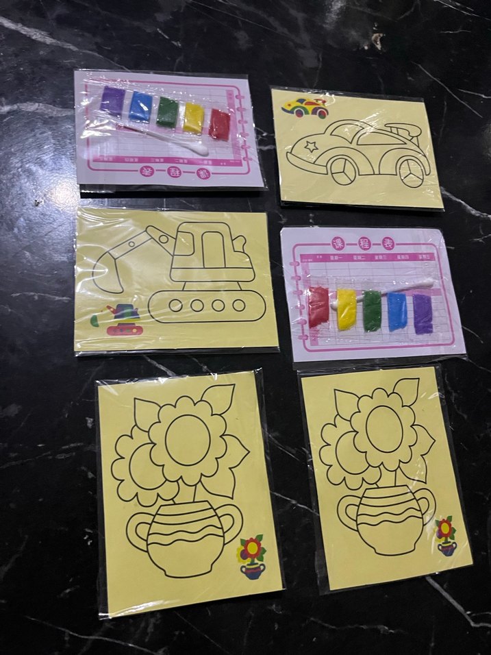 Çeşitli tasarımlara sahip renkli boyama setleri, okul etkinlikleri için ideal.