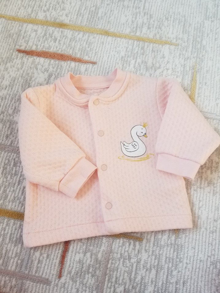 Uzun kollu, düğmeli ve yumuşak kumaştan yapılmış, bol kesim pembe kız çocuk hırka. Üzerinde nakışlı kuğu deseni bulunur.
