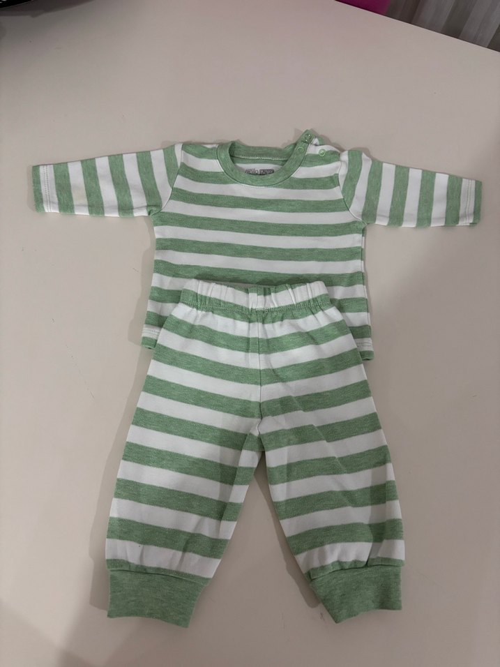 Yeşil beyaz çizgili, uzun kollu bebek takımı. Yumuşak ve sıcak kumaştan, bisiklet yaka ve lastikli bel detaylı, rahat kullanım sağlar.