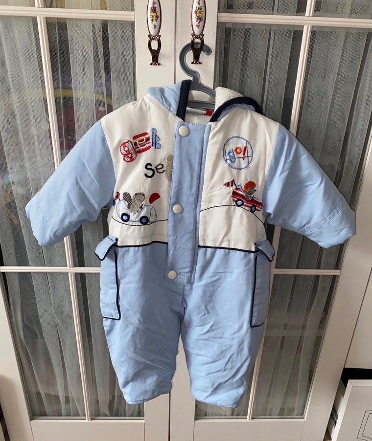 3-6 ay temiz defosuzdur. Pastel mavi renkli, düğmeli ve baskılı desenlere sahip erkek bebek kış tulumu. Yumuşak ve sıcak tutan polar kumaştan yapılmıştır, kapüşon ve cepler içerir. ❄️