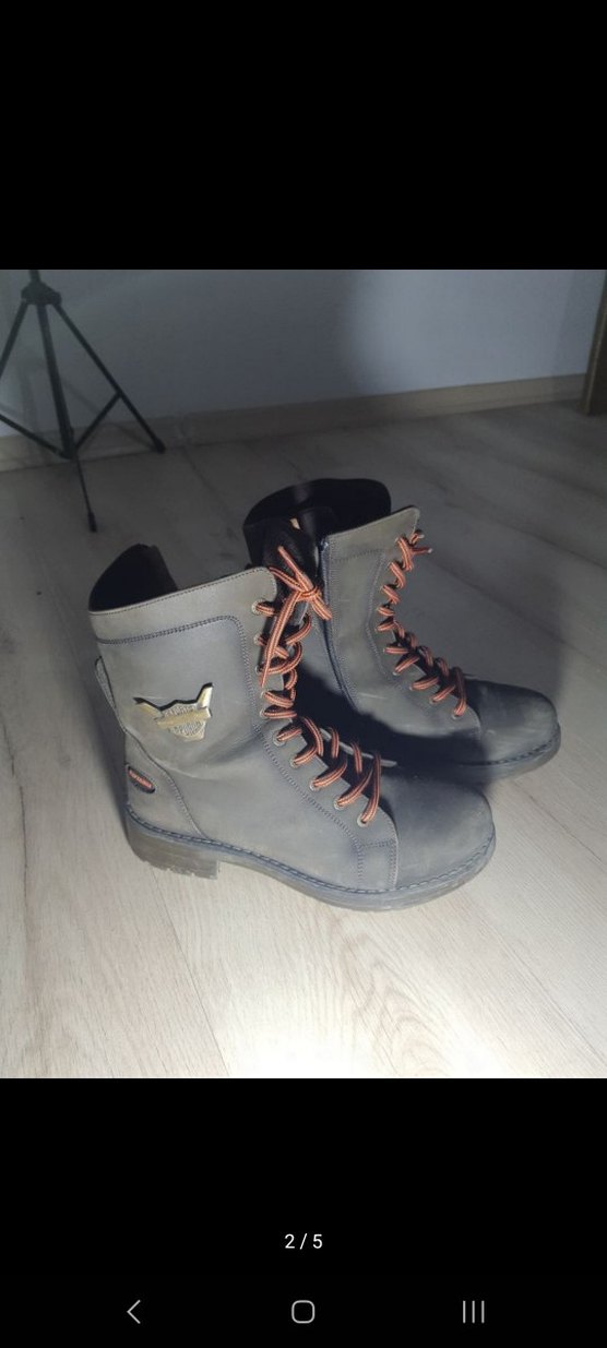 Gri süet biker tarzı kadın botları, stiletto topuklu ve tokalı detaylara sahip. Bağcıklı ve düz yüzeyli, trend günlük stil için uygun.