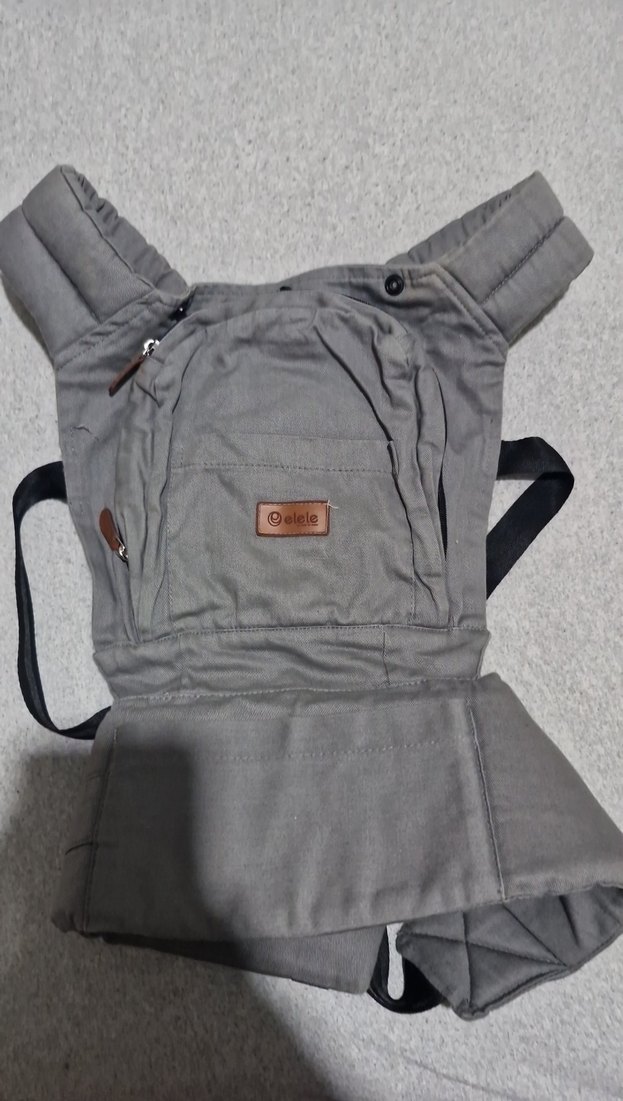 Gri renkli, omuz ve bel kayışları yastıklı bebek taşıyıcı kanguru. Önünde fermuarlı küçük cep bulunur.