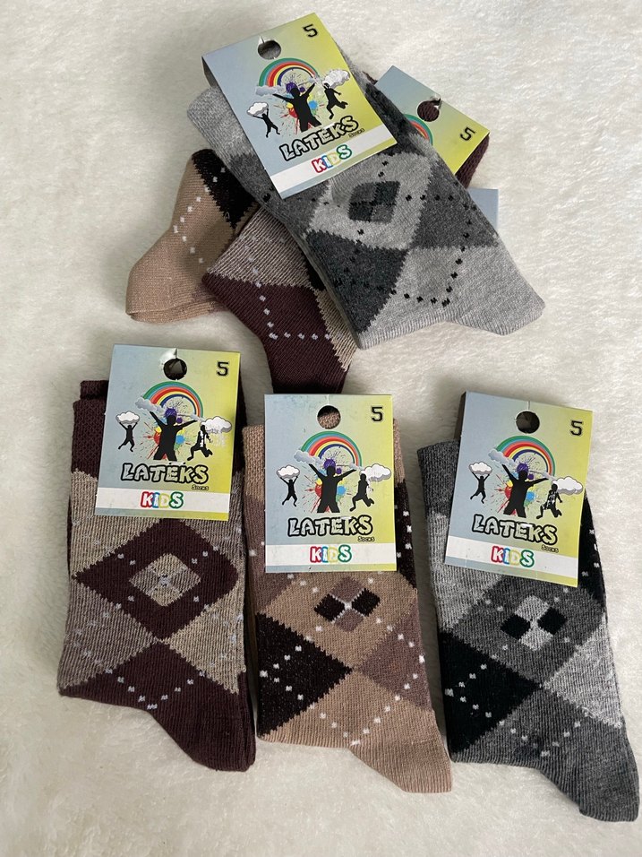 Erkek çocukları için çok renkli, yün kumaştan yapılmış argyle desenli çorap seti. Farklı kahverengi ve gri tonlarında, 5 numara, Lateks markası.