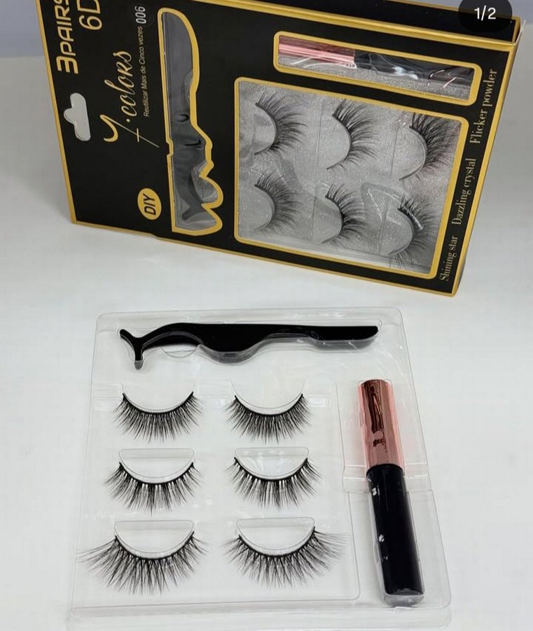 Üç çift siyah takma kirpik, kıvrık uygulama aracı ve yapıştırıcı içeren set, doğal ve dolgun görünüm sağlar.