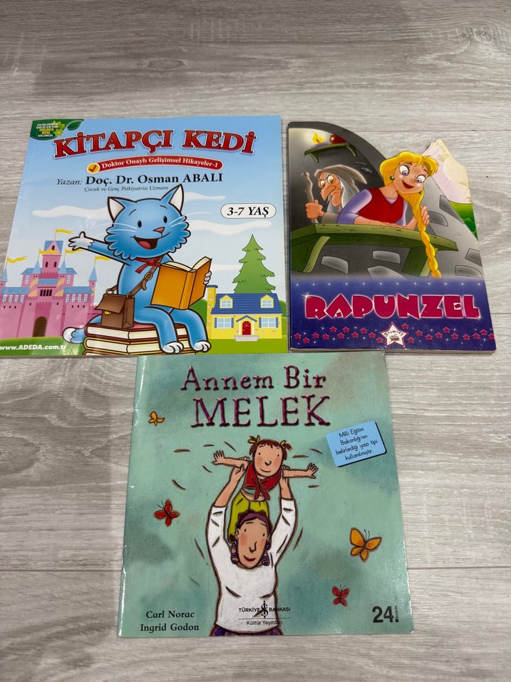 3-7 yaş arası çocuklar için Kitapçı Kedi, Rapunzel ve Annem Bir Melek kitapları seti. Eğlenceli ve öğretici hikayeler içerir.