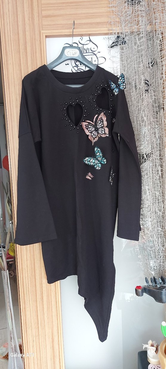 Birkaç kere kullandım. Çok şık bir tasarım.3 boyutlu kelebek detaylı,siyah boncuk detaylı,2 adet kalp pencere detaylı.Etepi asimetrik,kolları İspanyol.Şardonsuz,kalın penye.38/40/42 bedenlere olur.Ben kalp pencerelerden dolayı içine tül birşey giyiyordum.