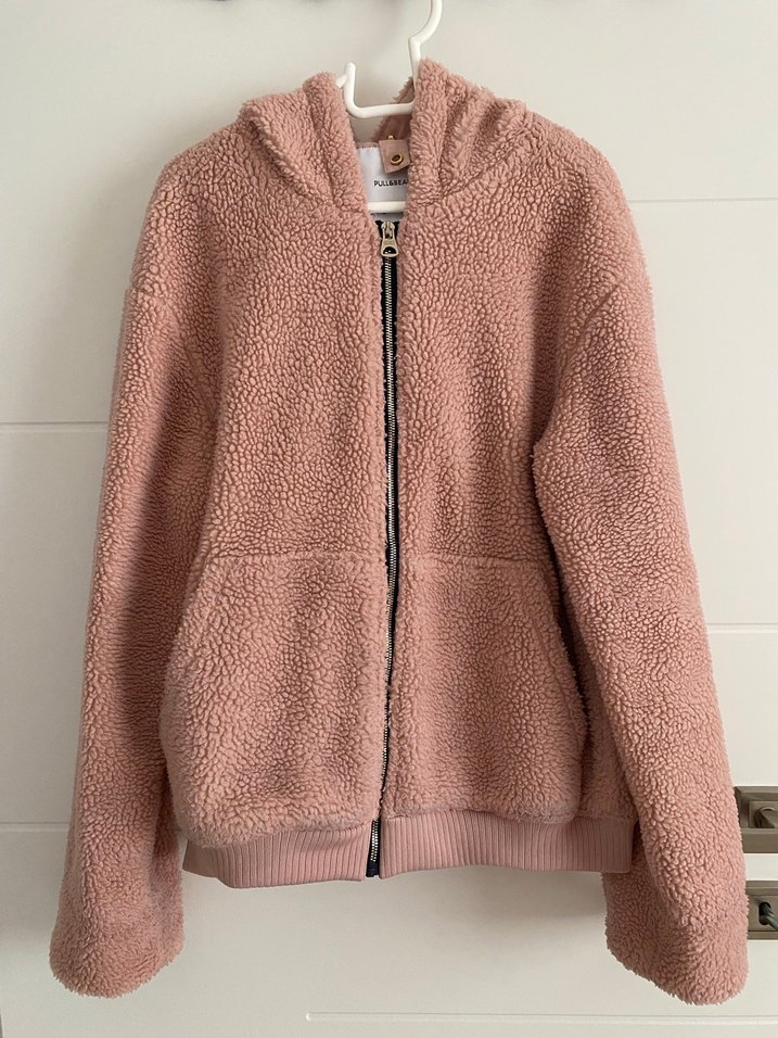Yumuşak ve sıcak kumaştan yapılmış, kapüşonlu ve fermuarlı pembe mont. Uzun kollu, bol kesim ve rahat sokak stili için uygun.