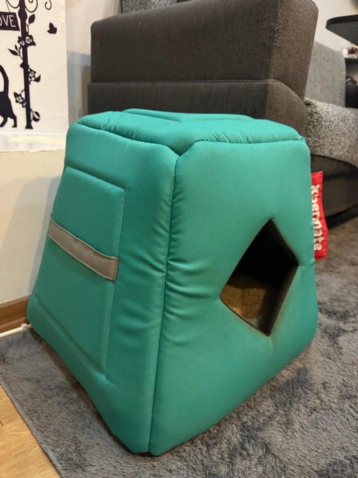 Turkuaz renkli, yumuşak kumaş kaplı kedi evi. Geometrik girişli ve yan tarafında küçük cep bulunan rahat bir dinlenme alanı sunar. Oyun ve dinlenme alanı olmak üzere 3 farklı şekilde kullanabilirsiniz.