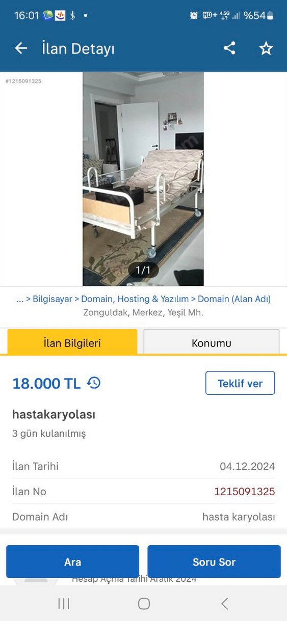 3 Gün Kullanılmış Hastane Yatağı