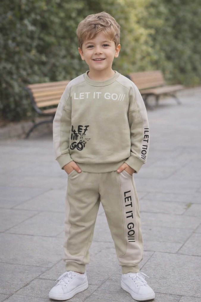 Bej renkli, uzun kollu, bisiklet yaka üst ve eşofman altından oluşan kadife bebek erkek takımı. "LET IT GO" yazılı desenli ve cırt cırtlı detaylara sahip.