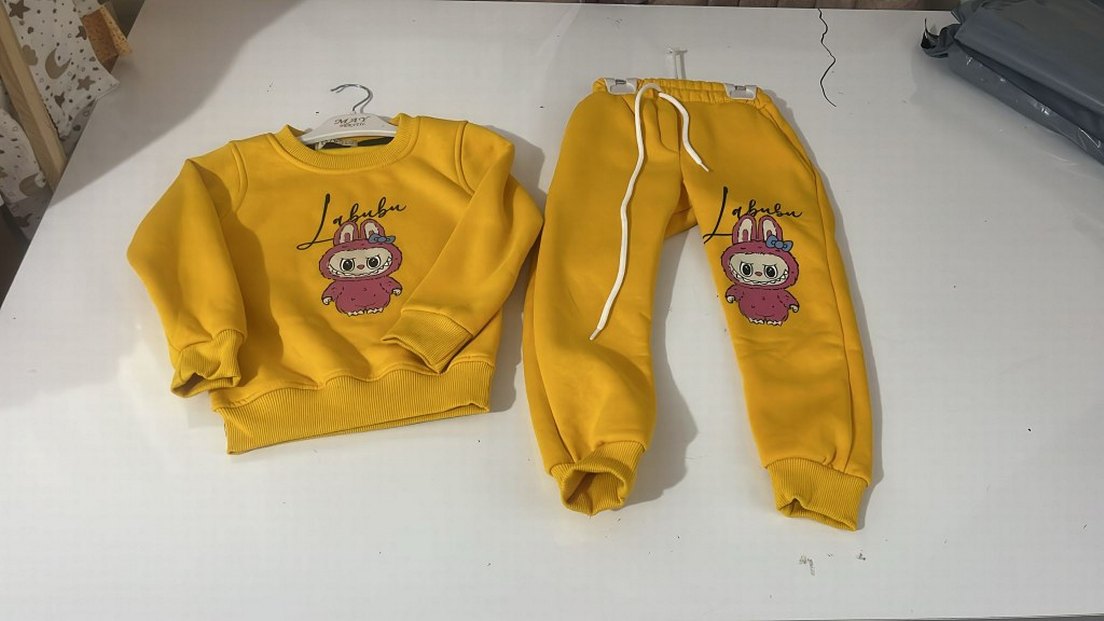 Sarı renkli, Labubu baskılı ve örgü detaylı kız çocuk eşofman takımı. Bol kesim, uzun kollu ve bisiklet yakalıdır. 3 iplik şardonlu kompakt kumaş kışlık kalın takım. Ürünün cep ve ip detayı mevcuttur. 6-7-8-10-11 yaş bedenleri mevcuttur
