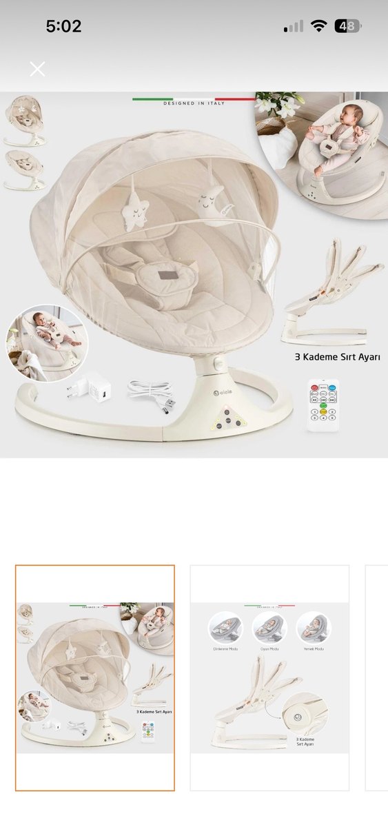 3 kademe sırt ayarlı, yumuşak dolgulu beyaz bebek ana kucağı. Tente ve oyuncaklar içerir. Uzaktan kumanda ve şarj aksesuarları dahildir. Bir ay kullanlmış
