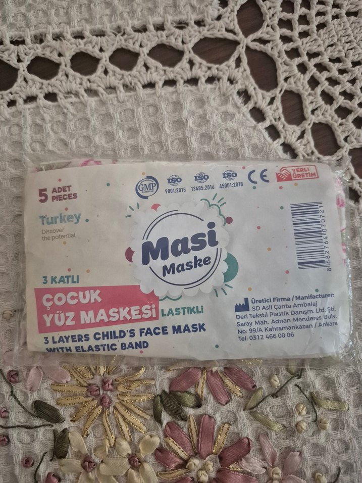 Masi markasına ait, 3 katlı, lastikli, pastel renklerde 5 adet çocuk yüz maskesi paketi. Türkiye üretimi.