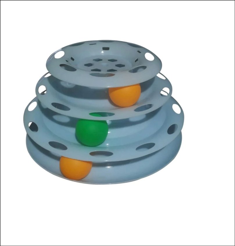 Gri renkte, üç renkli topun hareket ettiği çok katmanlı kedi oyuncağı, kedilerin ilgisini çeker ve eğlendirir.