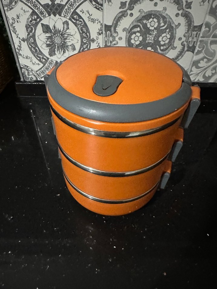 Turuncu ve gri renklerde, kilitli kapaklı, 3 katlı yemek termosu.