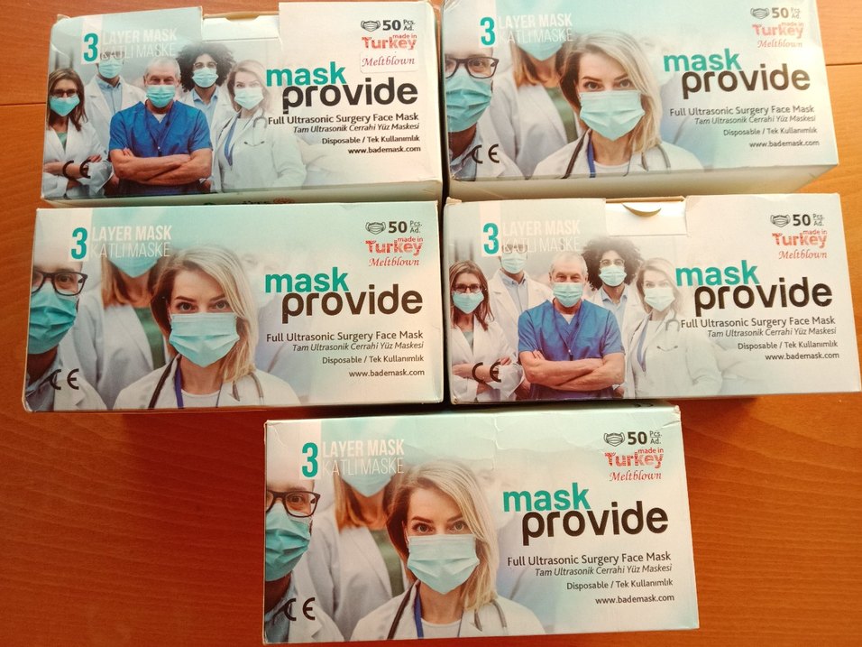 Türkiye'de üretilmiş, tam ultrasonik kaynaklı, meltblown kumaşlı 3 katmanlı tek kullanımlık cerrahi yüz maskesi, kutuda 50 adet bulunur. 5 paket fiyatıdır