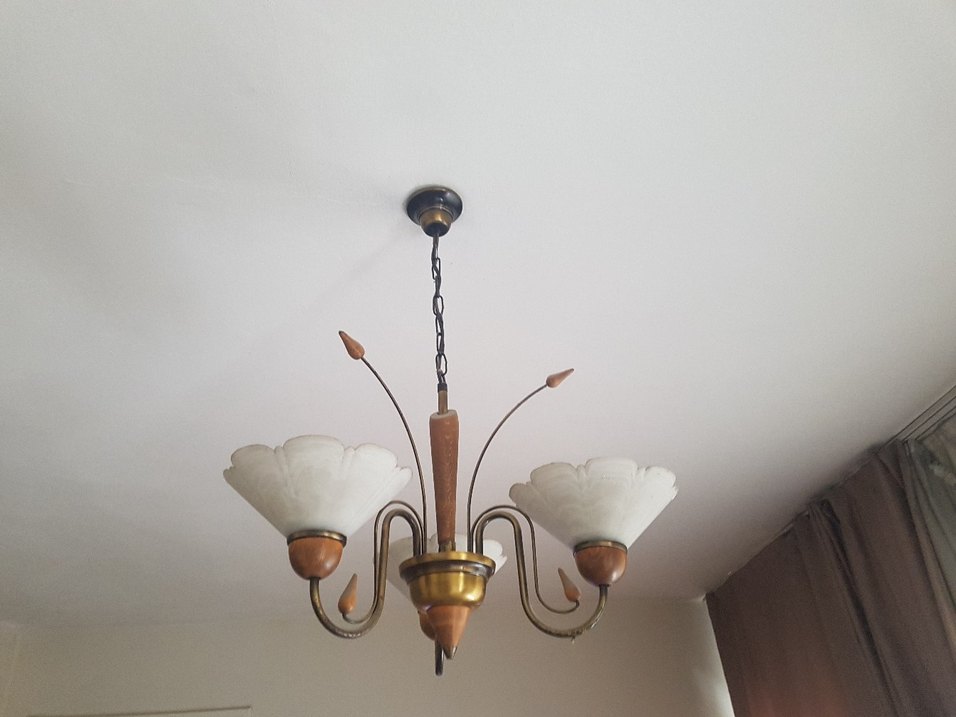 Bej renkte, zincirle tavana asılan, metal detaylı ve iki çiçek şeklinde aba lambası bulunan klasik avize.