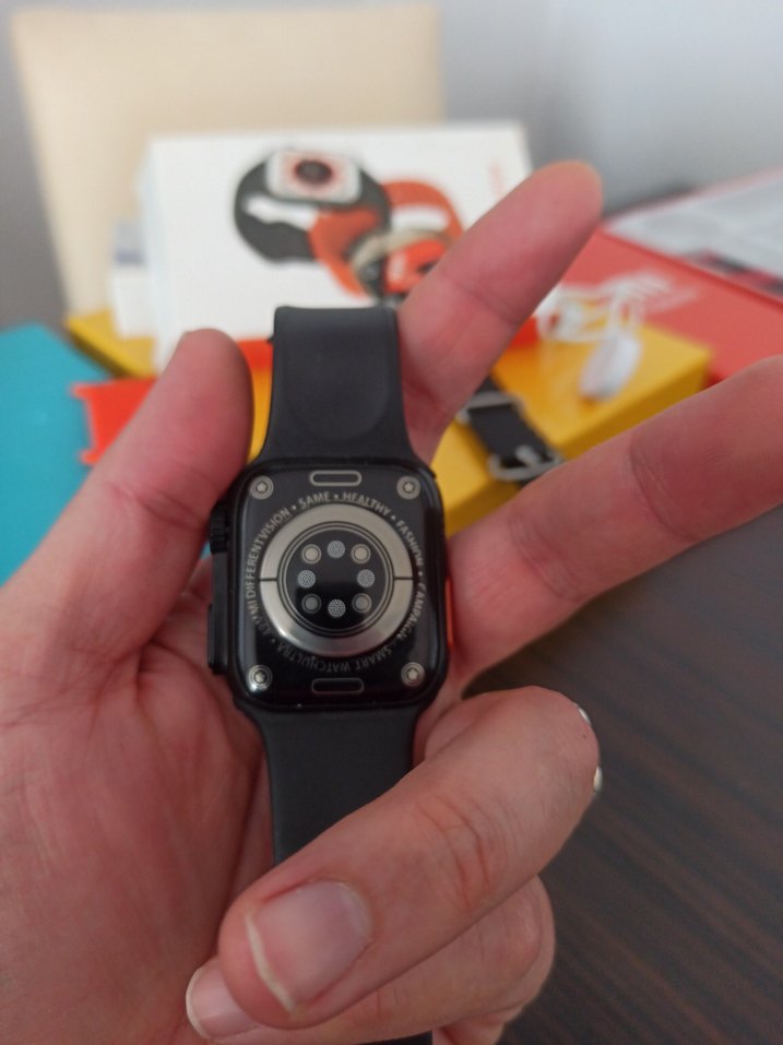 Ocean Siyah düz, siyah tırtıklı ve turuncu tırtıklı kordonu ile şarjı gördüklerim arasında en uzun giden diyebilirim Çok şık ve sade duruşu ile Watch 8 Ultra Akıllı saat.. ✍Siri özelliği ✍Telefon konuşma kalitesi doyurucudur. ✍Tüm sağlık uygulamaları (kan oksijen, nabız,kan basıncı....) ✍Şifre koyma özelliği ✍Kamera ✍Spor etkinlikleri ✍Tüm sosyal medya (face, , Twitter) ve niceleri ile siz değerli misafirlerimize sunuluyor.. Siyah, rahat kordonlu akıllı saat, arka tarafında kalp atış hızı sensörü bulunur. Orijinal kutusu ve aksesuarları ile birlikte. ⌚