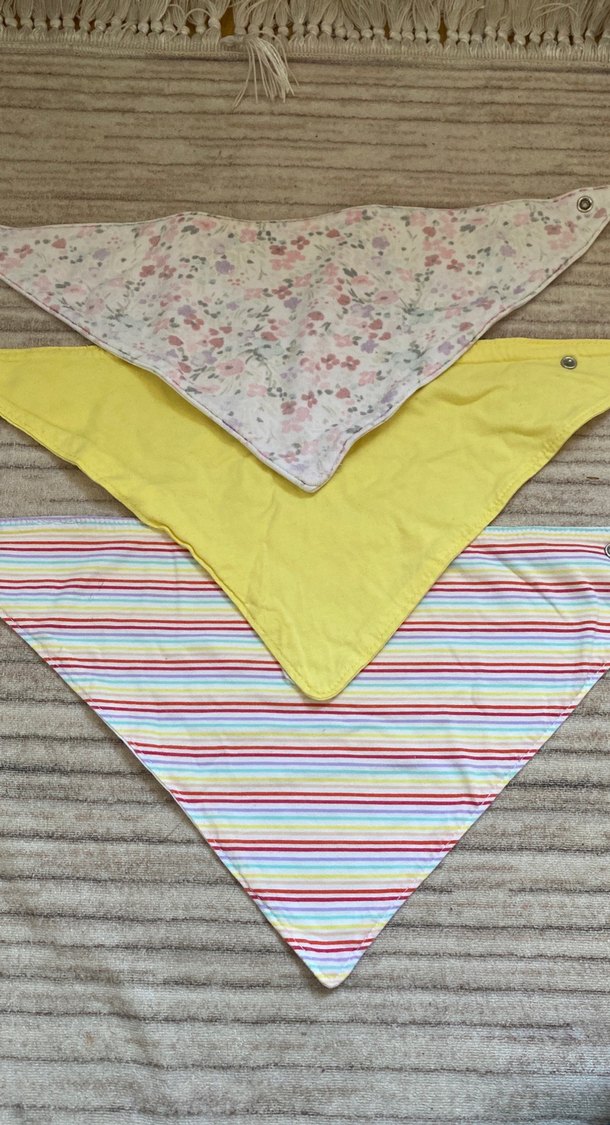 Pastel renklerde, bağlama düğmeli 3'lü bebek önlüğü seti. Bağlama ve çizgili desenler içerir, yumuşak ve rahat kumaştan yapılmıştır.