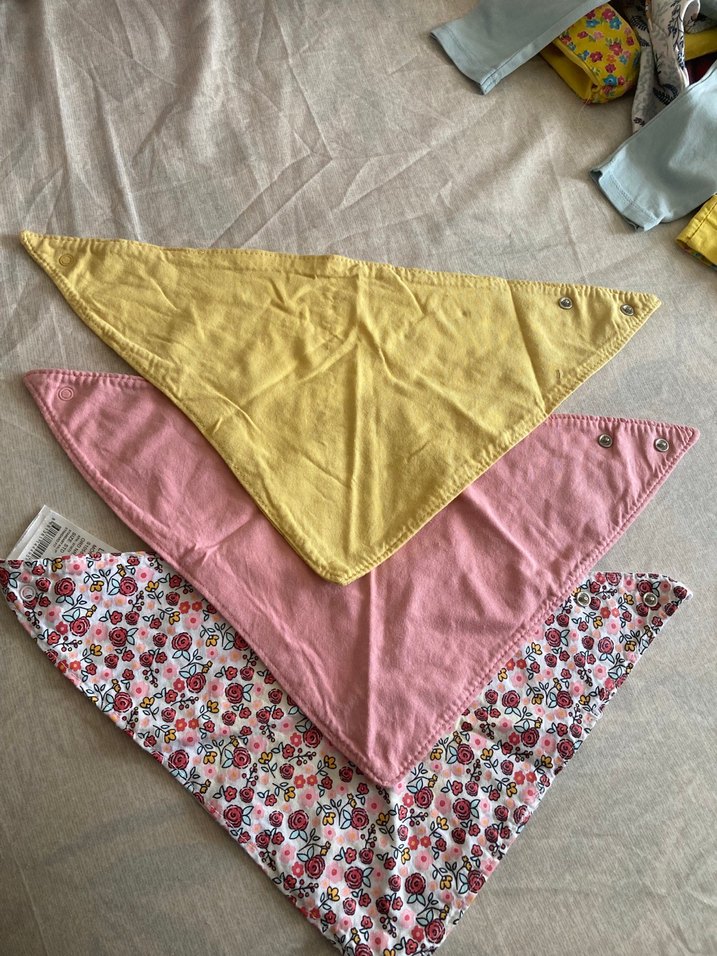 Pastel sarı, pembe ve çiçek desenli olmak üzere üçlü yumuşak kumaşlı bebek önlüğü seti, çıtçıt kapamalı.