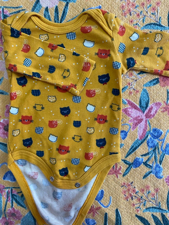 Sarı renkli, uzun kollu, düğmeli ve renkli desenli bebek body. Yuvarlak yakalı ve sokak tarzına uygun. 3 de hello baby marka ve gayet iyi durumda.