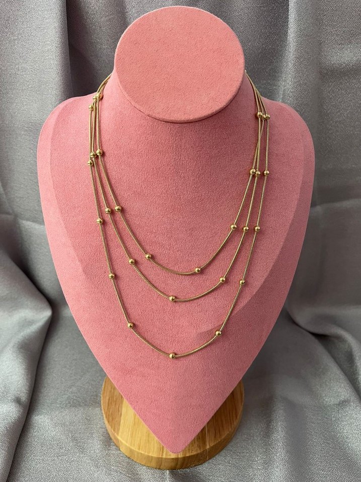 Uzun uzunlukta, altın rengi ve zincir detaylı, küçük boncuklarla sade ve çağdaş tarzda günlük kullanıma uygun kolye. Bohem, hippie ve retro stiller için ideal. ✨