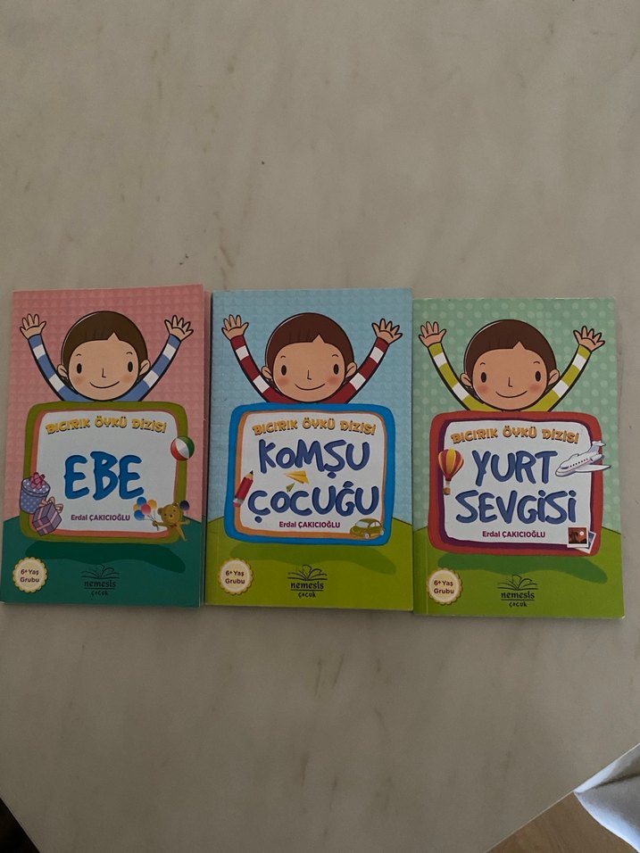 Ebe, Komşu Çocuğu ve Yurt Sevgisi adlı üç çocuk kitabından oluşan set, renkli ve neşeli kapak çizimleri içerir.