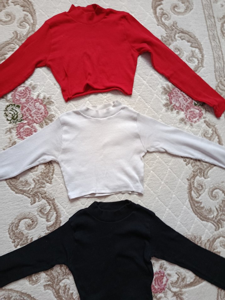 Pamuklu, uzun kollu, yarım balıkçı yaka ve kısa kesim kadın kazakları. Beyaz, kırmızı ve siyah renklerde, günlük sokak stiline uygun.