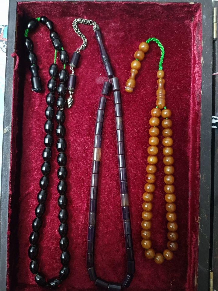 Üçlü erkek tesbih seti, koyu ve çok renkli boncuklarla geleneksel ve bohem tarzda. koleksiyondan satılmaktadır