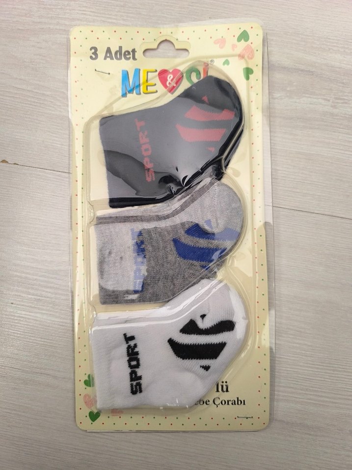 Gri, beyaz ve koyu gri renklerde, renkli baskılı desenler ve "SPORT" yazılı 3'lü erkek çorap seti.