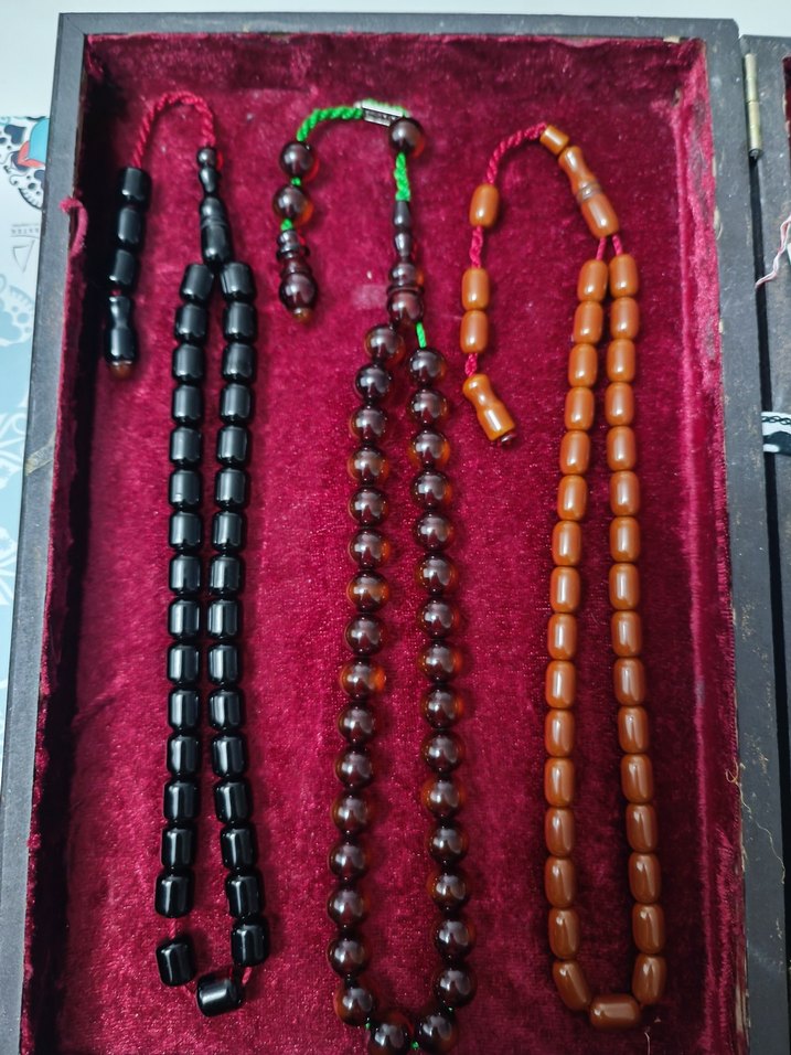Koyu ve çok renkli, bohem tarzda üç adet konvansiyonel erkek tesbih seti. koleksiyondan satılmaktadır