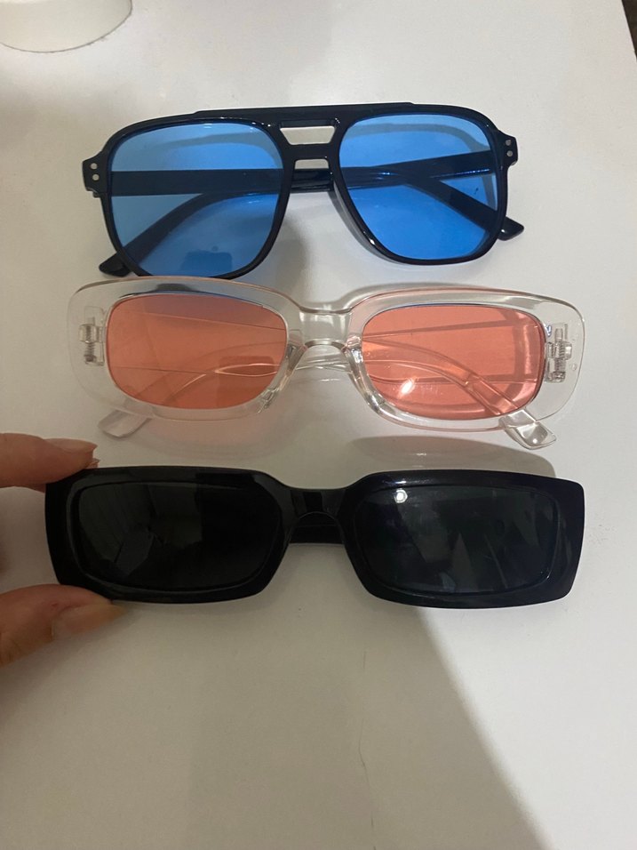 Şeffaf çerçeveli ve mavi, pembe, siyah renkli lenslere sahip üç adet kadın güneş gözlüğü, sokak stili ve minimalist tarza uygun. ️