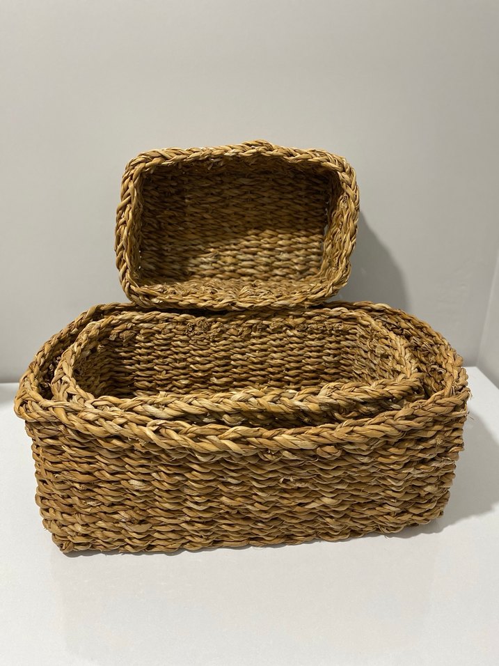 Doğal ve sağlam dokulu kahverengi hasır saklama sepetleri, çeşitli eşyalar için pratik düzenleme sağlar. Ürün sorunsuz 3 parça ve yeni neredeyse hiç kullanılmadı büyük orta ve küçük boydur.Orta boyun boyutu 28x17x11 cm büyük boy boyutu ise 33x23x12 cm küçük boy eni 15 cm boyu 21 cm yüksekliği 8 cm