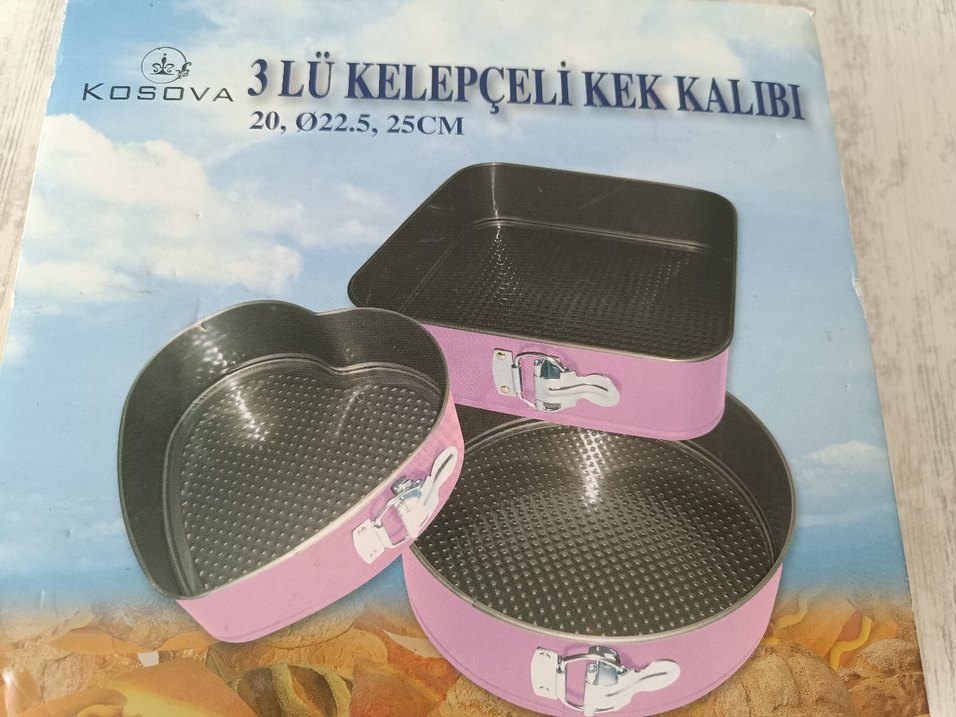 Yuvarlak, kare ve kalp şeklinde 3'lü renkli kelepçeli kek kalıbı seti, 20, 22.5 ve 25 cm ölçülerinde. yuvarlak olanı bir kaç kez kullandım