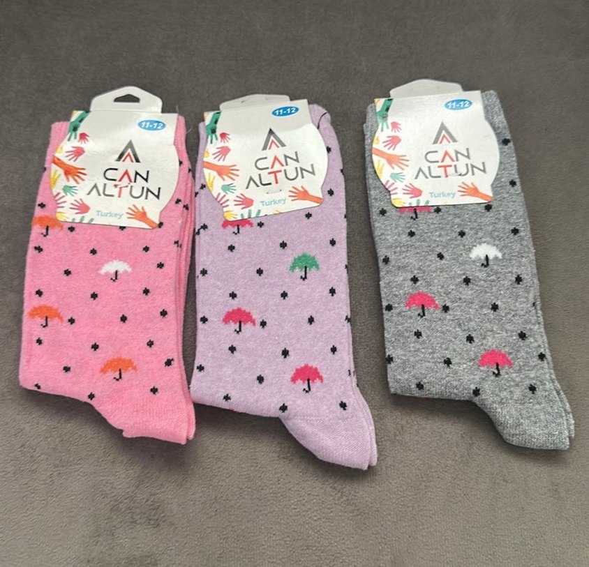 Yumuşak pamuklu kumaştan üretilmiş, çok renkli şemsiye baskılı kız çocuk çorabı. Can Altun markalıdır. 11-12 yaş