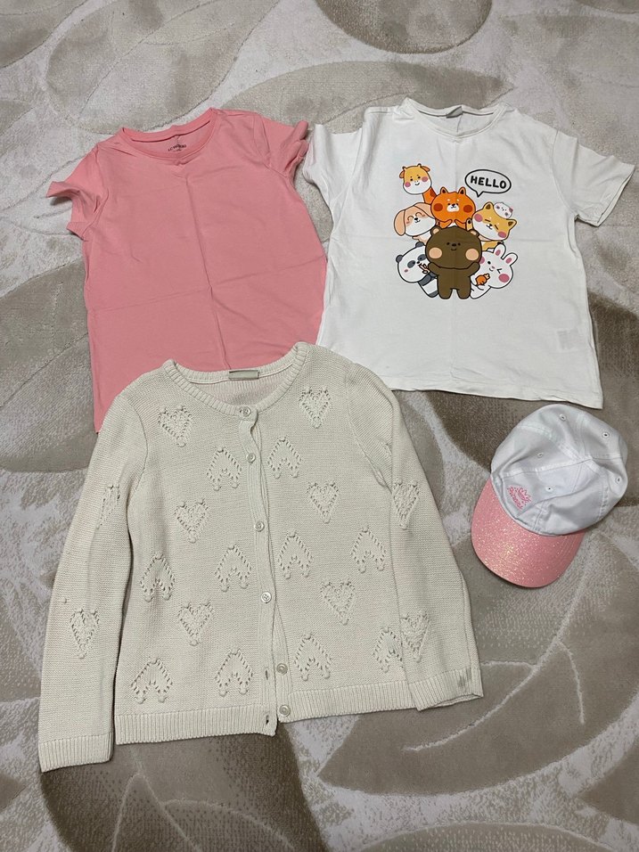 Pamuklu pembe ve beyaz kısa kollu tişörtler renkli baskılı çizgi film karakterleriyle süslenmiş. Rahat kesim, günlük sokak stili için uygun. Yumuşak ve konforlu kumaş. Krem rengi hırka ve beyaz şapka ile kombinlenmiştir.