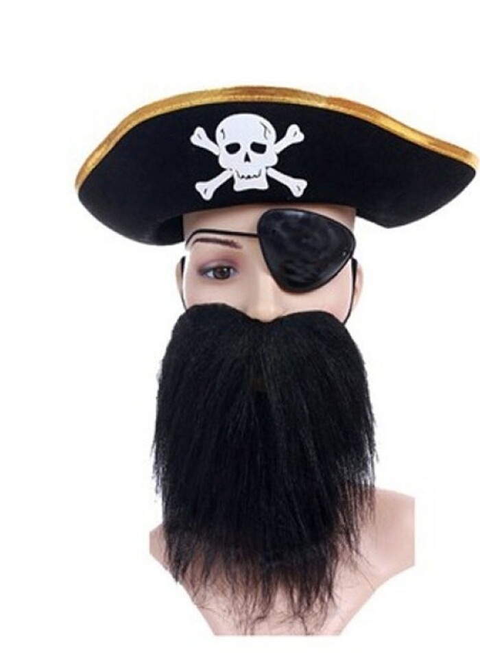 3 lü Korsan Set Çocuk Boy Altın Renk ÜRÜN DETAYLARI Korsan Şapkası Maske Sakal Seti Şapka Üzerinde korsan logosu mevcuttur Şapka siyah Renk Altın şeritlidir Korsan Göz Bandı Üzerinde Korsan Logosu Mevcuttur Sakal Renk : Siyah