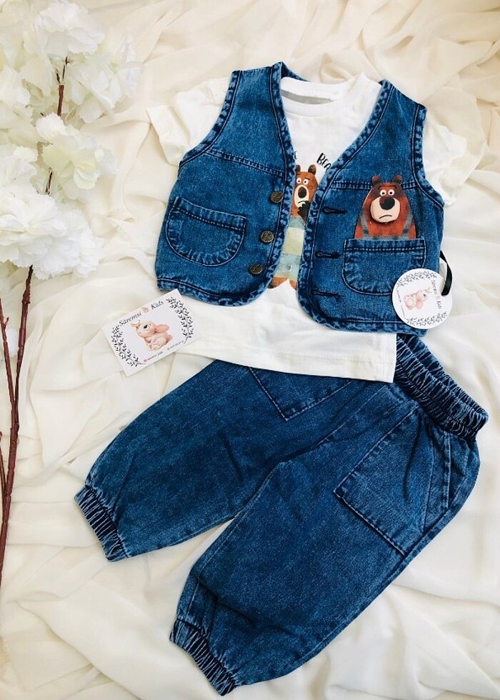 Kot yelek ve pantolonlu baskılı t-shirt cepli ayıcık kabartmalı 3 lü erkek bebek takım Tüm bedenler mevcuttur 6-9 ay 9-12 ay 12-18 ay 18-24 ay Tam kalıptır
