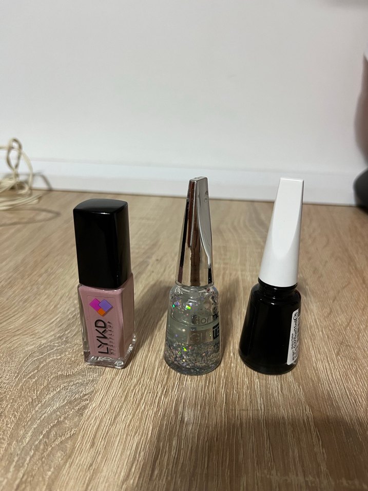Bej, simli ve gri tonlarda üçlü oje seti.