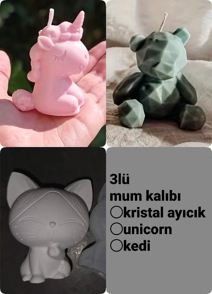 Kedi, unicorn ve geometrik ayıcık figürlerinden oluşan 3'lü pastel renklerde mum kalıbı seti. ️ 3 kalıbın fiyatıdır Unicorn, kedi ve kristal ayıcık modelde mum, taş tozu, biblo, seramik şekillendirmeye uygun tatlış biblolar, mumlar, tütsülükler yapabilirsiniz #slikon #kalıp #alçı #taştozu #minimüze #dekor #biblo #mum #obje #tütsü #müze #hobi