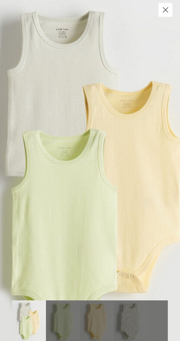 Pastel sarı, yeşil ve beyaz renklerde, yumuşak kumaştan yapılmış 3'lü bebek atlet body seti. Temiz ve sorunsuz. kurutma makinesinde bir miktar çekme yaptı o yüzden 1-3 ay için uygun olur. Ölçüsü fotoğraflarda görünüyor ona bakarak alım yapabilirsiniz. %100 pamuk.