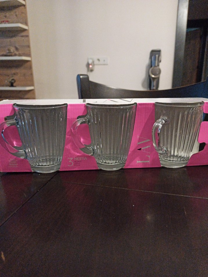 Pembe kutuda üç adet kulplu, dikey çizgili cam bardak seti. Her bardak klasik bir görünüme sahiptir. ☕